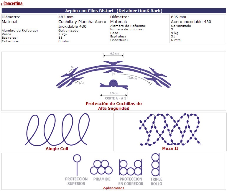 Las Cercas de Cuchillas o Concertinas son una barricada u obstáculo de protección, de forma helicoidal, fabricada con elementos de acero inoxidable, con grupos de cuchillas igualmente espaciadas, lo que la hace impenetrable.