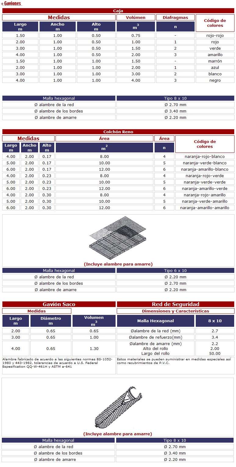 Los gaviones consisten en una caja o cesta de forma prismática rectangular, rellena de piedra, de enrejado metálico de malla. Se colocan a pie de obra desarmados y, una vez en su sitio, se rellenan con piedras del lugar.