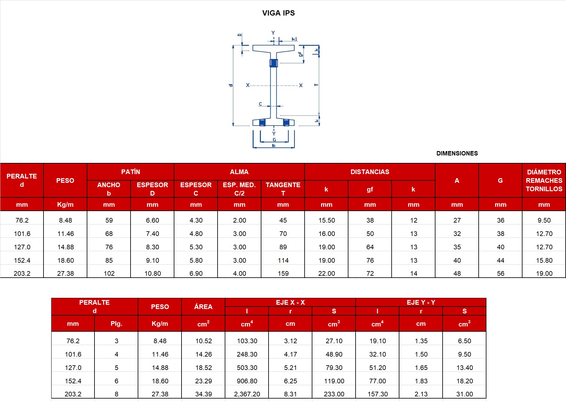 La viga ips (perfil “i” estándar) conocida por todos ya que se utiliza principalmente para la construcción de bóvedas caseras, la medida más usual es la de 5” y en esta viga la única variable es el peralte. Este perfil se maneja en largos de 12 o de 15 metros de largo según su procedencia.